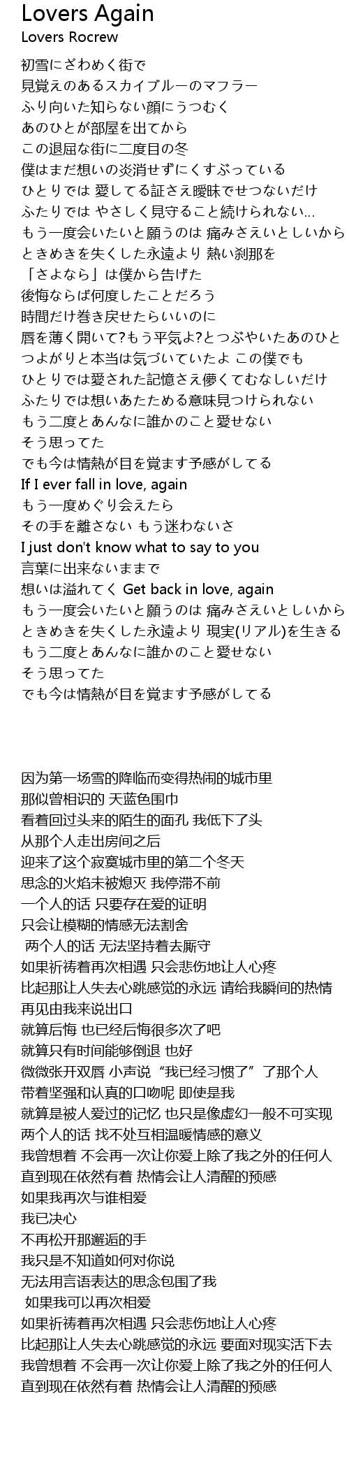ふたりでは 想いあたためる意味見つけられない もう二度とあんなに誰かのこと愛せない そう思ってた でも今は情熱が目を覚ます予感がしてる If I ever fall in love, again もう一度めぐり会えたら その手を離さない もう迷わないさ I just don't know what to say to youここで使われているLoversは「恋人」の意味で使われてるんだと思います。 Loverめ、奥が深いぜ。 今後私のように、同じ間違いをする人が減りますように! Loverの意味は「恋人」だけじゃないんですよ。 ちゃんと覚えておいてくださいね。EXILE 冬の名バラード「Lovers Again」。 "again"=「ふたたび」。